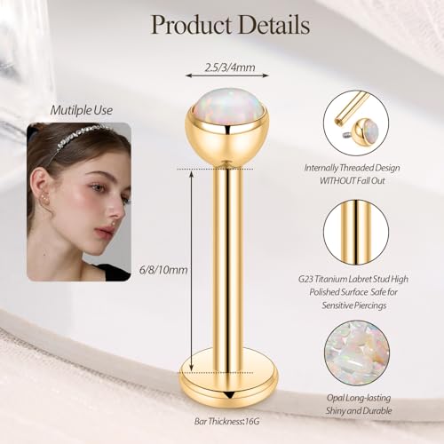 GAGABODY 16g Tragus Earring Lip Studs G23 Titanium Labret Studs Internally Threaded Labret Silver Helix Jewelry 16g Earrings Opal Cartilage Piercing 6mm