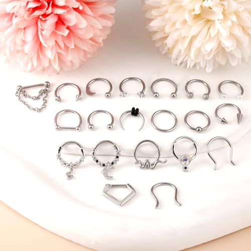 - 【Complete Set】:One silver septum rings set in different styles, including septum horseshoe rings, dangle septum jewelry, clicker septum rings, U shape nose septum, round ball septum ring, and other multiple styles septum. Septum nose rings for women with plenty of styles to easy matching your daily wear.